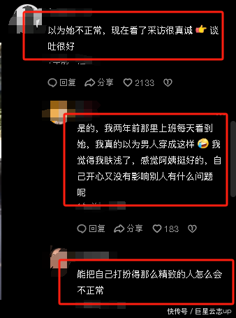 “我两年前那处上班每天看到她,我竟然以为男东谈主穿成这样,我认为我浅易了,嗅觉大姨挺好的,我方郁勃又莫得影响别东谈主有什么问题呢”