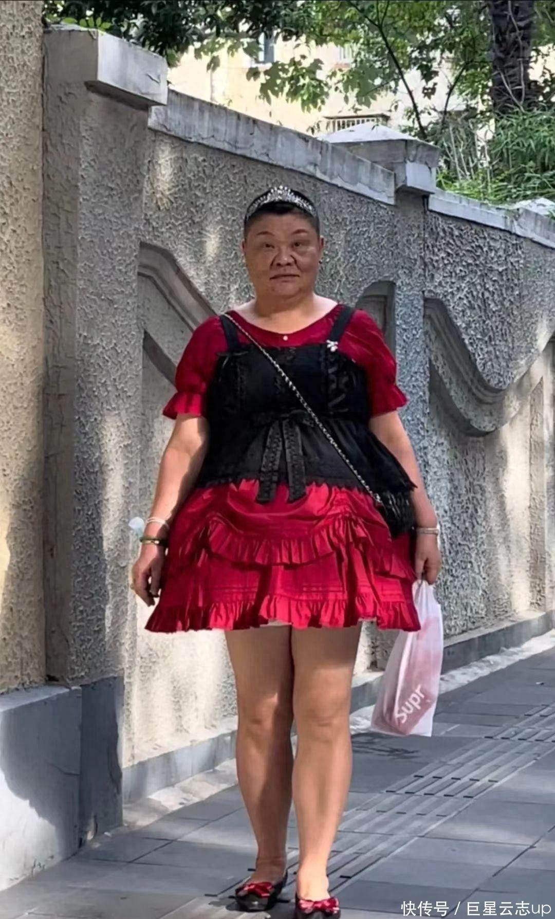 可能有了前提后,在有网友偶尔拍到了这位50岁的大姨衣服激烈反差,极度不般配的公主裙走在路上,可能第一响应即是,又一个博流量,想出名的网红。